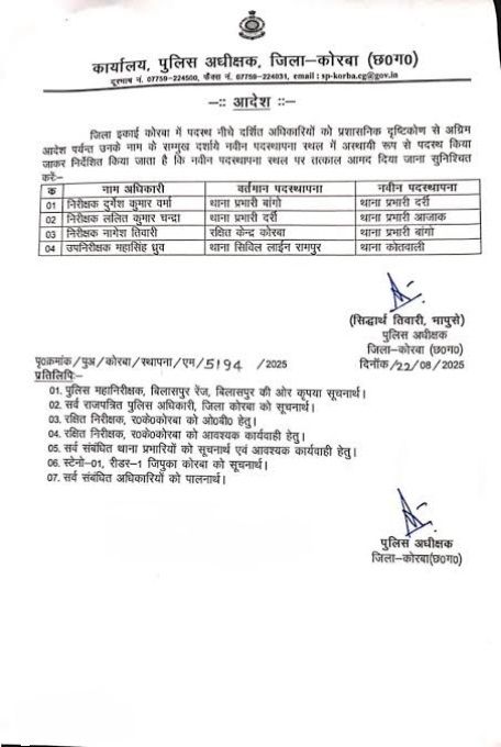 कोरबा: 4 थाना प्रभारी हुए इधर से उधर , एसपी सिद्धार्थ तिवारी ने दिए आदेश