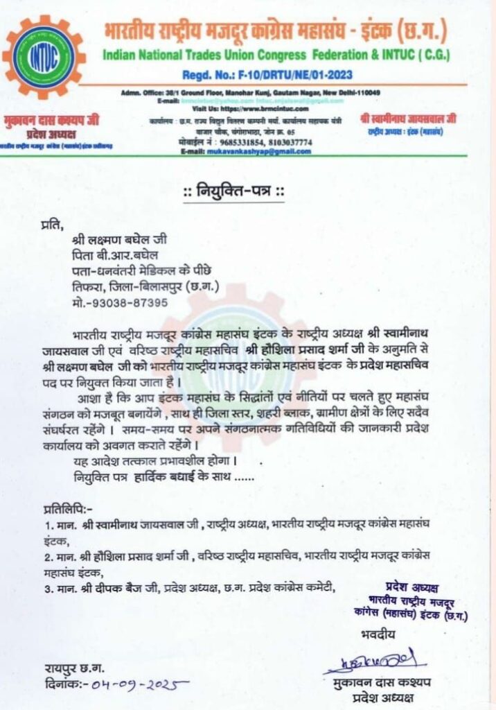 बिलासपुर। भारतीय राष्ट्रीय मजदूर कांग्रेस महासंघ इंटक के राष्ट्रीय अध्यक्ष श्री स्वामी नाथ जायसवाल जी एवं वरिष्ठ राष्ट्रीय महासचिव श्री हौशिला प्रसाद शर्मा जी की अनुमति से लक्ष्मण बघेल तिफरा निवासी को भारतीय राष्ट्रीय मजदूर कांग्रेस महासंघ इंटक के प्रदेश महासचिव पद पर नियुक्त किया गया है।