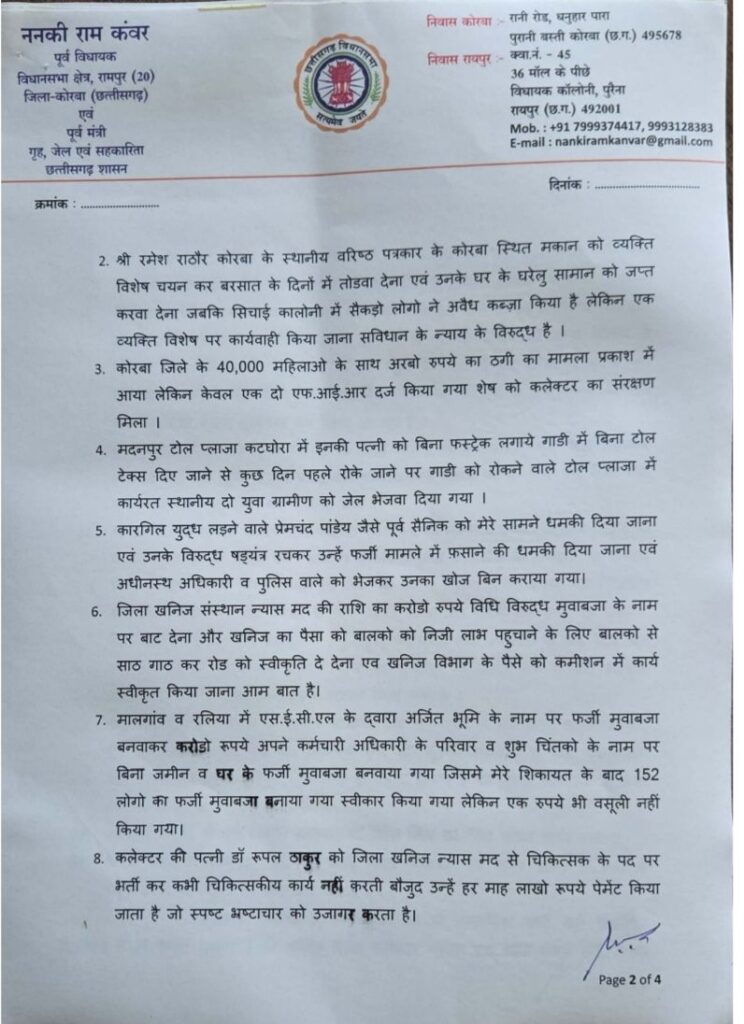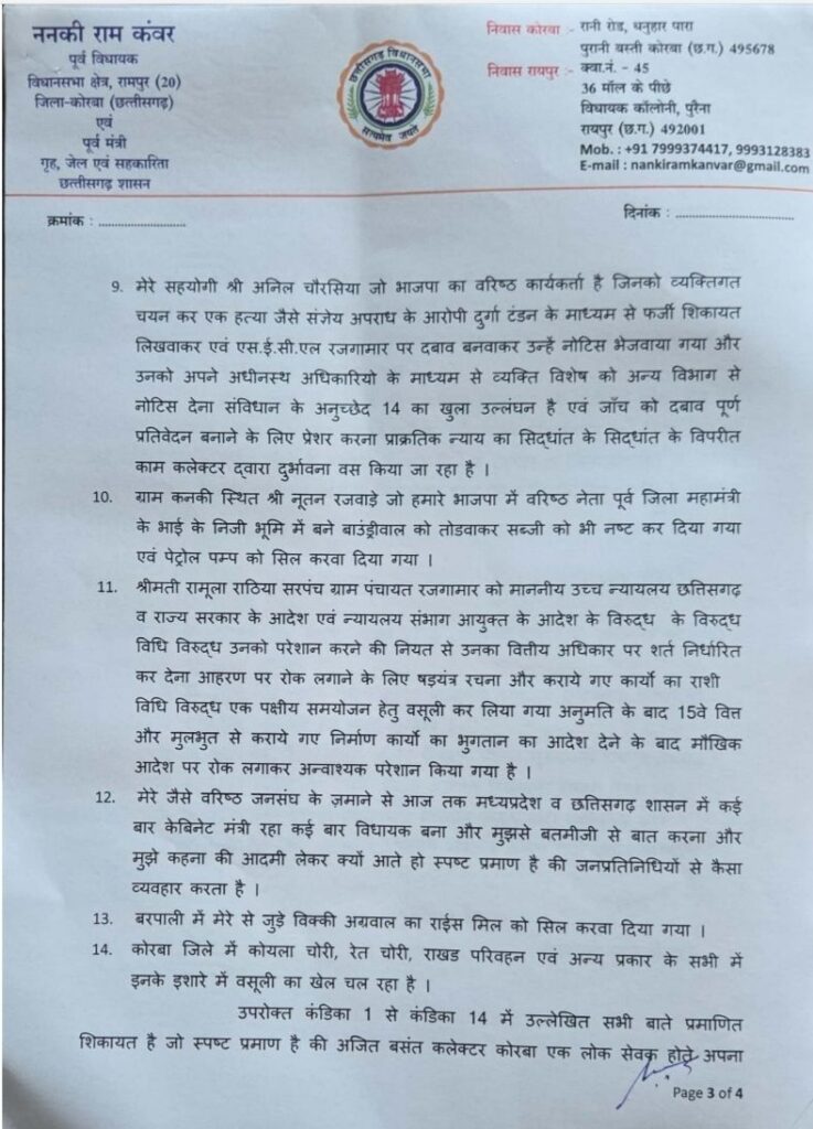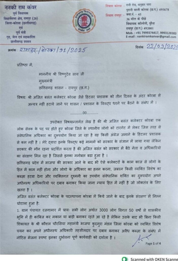 उन्होने मुख्यमंत्री विष्णुदेव साय को पत्र लिखकर जहां कोरबा कलेक्टर को हिटलर प्रशासक बता दिया। वहीं उन्होने कलेक्टर द्वारा संवैधानिक अधिकार का दुरूपयोग करने का भी आरोप लगाया है। चार पन्ने के इस पत्र में ननकीराम कंवर ने मुख्यमंत्री से कलेक्टर अजीत वसंत का 3 दिन के भीतर तबादला करने की मांग की है। उन्होने ऐसा नही करने पर शासन-प्रशासन के खिलाफ धरने पर बैठने की चेतावनी दी है। गौरतलब है कि उर्जाधानी के नाम से मशहूर कोरबा जिले में प्रशासनिक अफसरों का कुछ एक राजनेताओं के साथ संबंध कभी भी अच्छा नही रहा है।फिर चाहे वो भाजपा के पूर्व मंत्री ननकीराम कंवर हो या फिर कांग्रेस के पूर्व मंत्री जयसिंह अग्रवाल, स्थानीय मुद्दे और अन्य मामलों को लेकर अक्सर इन राजनेताओं की IAS अफसरों के साथ ही प्रशासनिक अफसरों से ठनी ही रही। इसी टकराहट का परिणाम रहा कि जिले में विकास कार्य सालों साल बाधित रहे और राजनेता जनहित के मुद्दे से भटक कर अफसरों को सबक सिखाने में समय बर्बाद करते रहे। खैर अब ये देखने वाली बात होगी कि सूबे के वरिष्ठ आदिवासी नेता ननकीराम कंवर के इस पत्र पर सरकार किस तरह से संज्ञान लेती है, ये तो आने वाला वक्त ही बतायेगा।