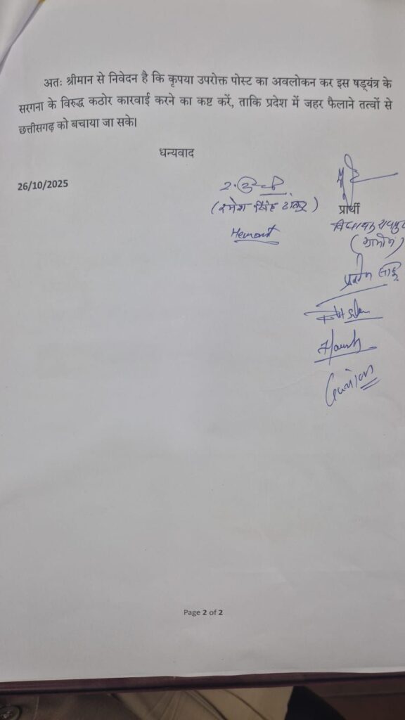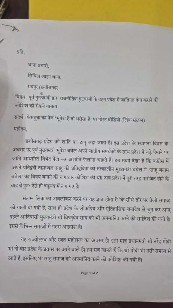 रायपुर: छत्तीसगढ़ की राजधानी रायपुर में रविवार की शाम एक बार फिर से राजनीति गर्म हो गई। दरअसल, BJP OBC वर्ग के नेता सिविल लाइन थाना पहुंचे थे। इस दौरान उन्होंने पूर्व सीएम भूपेश बघेल के खिलाफ पुलिस को शिकायत दी। अपनी शिकायत में इन नेताओं ने लिखा कि भूपेश बघेल ने तेली समाज का अपमान किया है। दरअसल, रायपुर ग्रामीण से BJP विधायक मोतीलाल साहू के नेतृत्व में ये नेता सिविल लाइन थाना पहुंचे थे। अपनी शिकायत में BJP OBC वर्ग ने लिखा की भूपेश बघेल ने तेली समाज का अपमान किया है। “भूपेश है तो भरोसा है” नामक पेज से तेली समाज को गाली दी गई है। भूपेश बघेल जातीय अशांति फैलाना चाहते हैं। साथ ही यह भी आरोप लगाया गया कि वीडियो में CM साय का भी अपमान किया गया है। आपत्तिजनक गाना डालकर CM साय का अपमान किया गया है।बता दें कि पुलिस को लिखे गए शिकायत में कहा गया है कि इस बार प्रदेश की स्थापना दिवस के अवसर पर पूर्व मुख्यमंत्री भूपेश बघेल अपने जातीय समर्थकों के साथ प्रदेश में बड़े पैमाने पर जाति आधारित भेद पैदा कर अशांति फैलाना चाहते हैं। हम सब ने देखा है कि कांग्रेस में अपने प्रतिद्वंदी ताम्रध्वज साहू की प्रतिद्वंदिता को तत्कालीन मुख्यमंत्री बघेल ने ‘साहू बनाम बघेल’ का विषय बनाने की लगातार कोशिश की थी। अब प्रदेश में बुरी तरह पराजित होने के बाद वह पुनः ऐसे ही षड़यंत्र में लग गए हैं।पत्र में आगे कहा है कि उन्होंने जो पोस्ट किया है उसको देखकर ऐसा लगता है कि सीधे तौर पर तेली समाज को गाली दी गई है। साथ ही प्रदेश के लोकप्रिय और ऐतिहासिक जनादेश से चुनकर आए पहले आदिवासी मुख्यमंत्री विष्णु देव साय को भी अपमानित करने की साजिश रची गई है। जिससे विभिन्न समाजों में गहरा आक्रोश है। पत्र में आगे लिखा गया है कि यह राज्योत्सव और रजत महोत्सव का अवसर है, इस अवसर पर प्रधानमंत्री मोदी भी प्रदेश में दो बार आने वाले हैं। ऐसे में हम जानते हैं कि मोदी भी इसी समाज से आते हैं इसलिए भी साहू समाज को अपमानित करने की कोशिश की गई है।शिकायत करने रायपुर ग्रामीण विधायक मोतीलाल साहू, बीजेपी जिला अध्यक्ष रमेश ठाकुर, जिला उपाध्यक्ष ललित जैसिंघ, अकबर अली, अमित मेसरी, गुंजन प्रजापति, पुष्पेंद्र पहुंचे।
