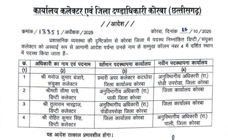 कोरबा। कलेक्टर अजीत वसंत ने प्रशासनिक व्यवस्था के दृष्टिकोण से एसडीएम के प्रभार में बदलाव किया है। जिला कार्यालय में पदस्थ रोहित कुमार सिंह को पाली का एसडीएम पदस्थ किया गया है वहीं संयुक्त कलेक्टर मनोज कुमार बंजारे को पोड़ी उपरोड़ा के एसडीएम बनाए गए हैं। पोड़ी उपरोड़ा में पदस्थ एसडीएम तुला राम भारद्वाज को जिला कार्यालय पदस्थ किया गया तथा सीमा पात्रे पाली SDM को जिला कार्यालय पदस्थ किया गया है।