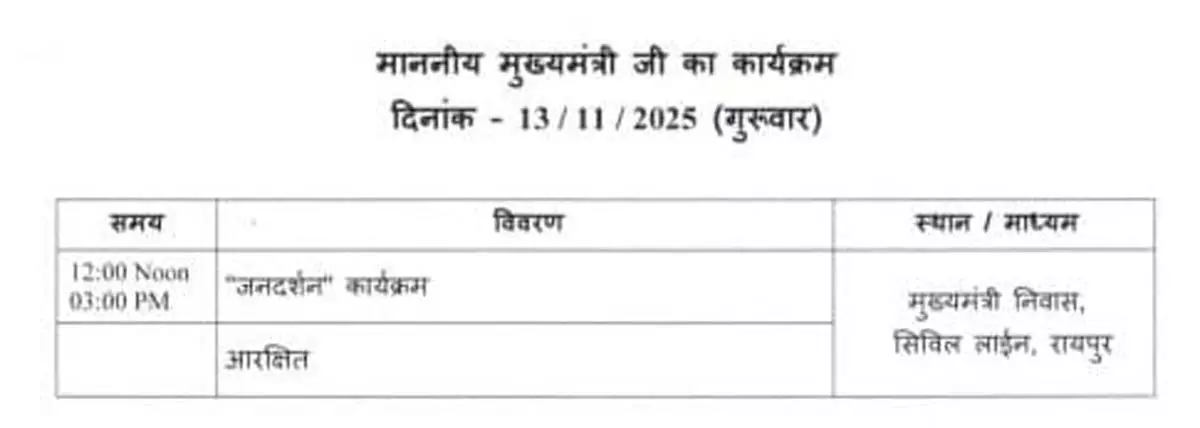 रायपुर। छत्तीसगढ़ में एक बार फिर से जनदर्शन कार्यक्रम की शुरुआत होने जा रही है। मुख्यमंत्री निवास में आयोजित होने वाला यह कार्यक्रम जनता और शासन के बीच सीधा संवाद स्थापित करने की दिशा में एक बड़ा कदम माना जा रहा है। मुख्यमंत्री विष्णु देव साय 13 नवंबर, गुरुवार को दोपहर 12:00 बजे से 3:00 बजे तक प्रदेशवासियों से मुलाकात करेंगे और उनकी समस्याएं स्वयं सुनेंगे। इस पहल को मुख्यमंत्री के जनसरोकारों के प्रति समर्पण और पारदर्शी शासन की मिसाल के रूप में देखा जा रहा है। राज्य सरकार का उद्देश्य है कि आम जनता की समस्याएं सीधे मुख्यमंत्री के संज्ञान में आएं और उनका समाधान समयबद्ध तरीके से किया जा सके। मुख्यमंत्री ने सभी अधिकारियों को सख्त निर्देश दिए हैं कि जनदर्शन में प्राप्त प्रत्येक आवेदन का संवेदनशील और त्वरित निराकरण किया जाए। उन्होंने यह भी कहा है कि हर शिकायत या सुझाव को गंभीरता से लें और आवश्यकता पड़ने पर फील्ड विजिट भी की जाए ताकि जनता को वास्तविक राहत मिल सके। इस जनदर्शन कार्यक्रम में नागरिक अपने व्यक्तिगत, प्रशासनिक, सामाजिक या विकास से जुड़े मुद्दे सीधे मुख्यमंत्री के सामने रख सकेंगे। यह उन लोगों के लिए विशेष अवसर होगा जो सरकारी दफ्तरों में अपनी बात रखने में कठिनाई महसूस करते हैं या जिनकी समस्याएं लंबे समय से लंबित हैं। मुख्यमंत्री से सीधी मुलाकात का यह मंच उन्हें अपनी बात खुलकर कहने का मौका देगा।
