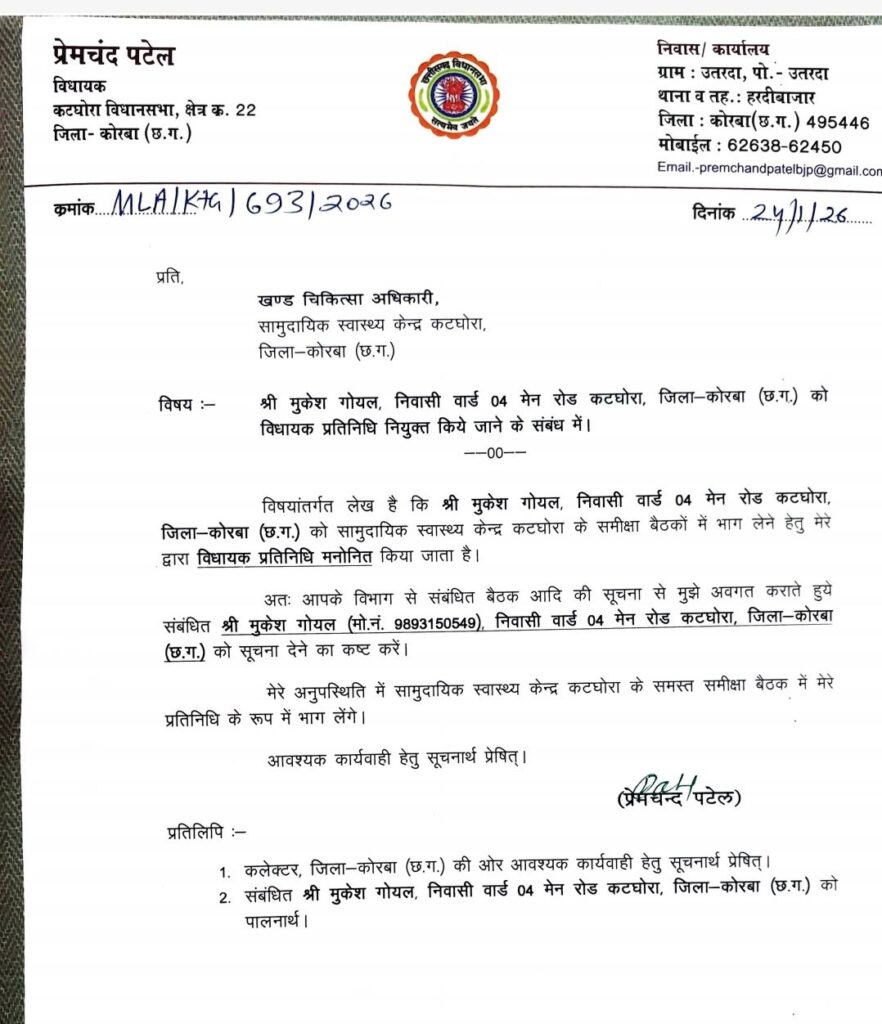कटघोरा। सामुदायिक स्वास्थ्य केंद्र के समीक्षा बैठकों में भाग लेने के लिए कटघोरा विधायक प्रेमचंद पटेल अपना प्रतिनिधि नियुक्त किए हैं। मुकेश के विधायक प्रतिनिधि बनने से जहां एक ओर शासकीय चिकित्सक एवं अस्पताल कर्मचारियों में खुशी का माहौल दिखाई दिया वहीं दूसरी ओर नगरवासी एवं भाजपा कार्यकर्ताओं ने भी ढेरों बधाइयां दी है। मुकेश गोयल वरिष्ठ भाजपा कार्यकर्ता होने के साथ साथ नगर के प्रतिष्ठित व्यवसायी हैं।