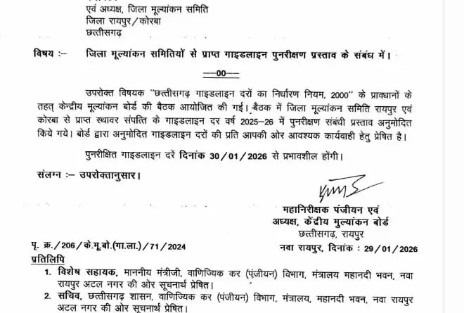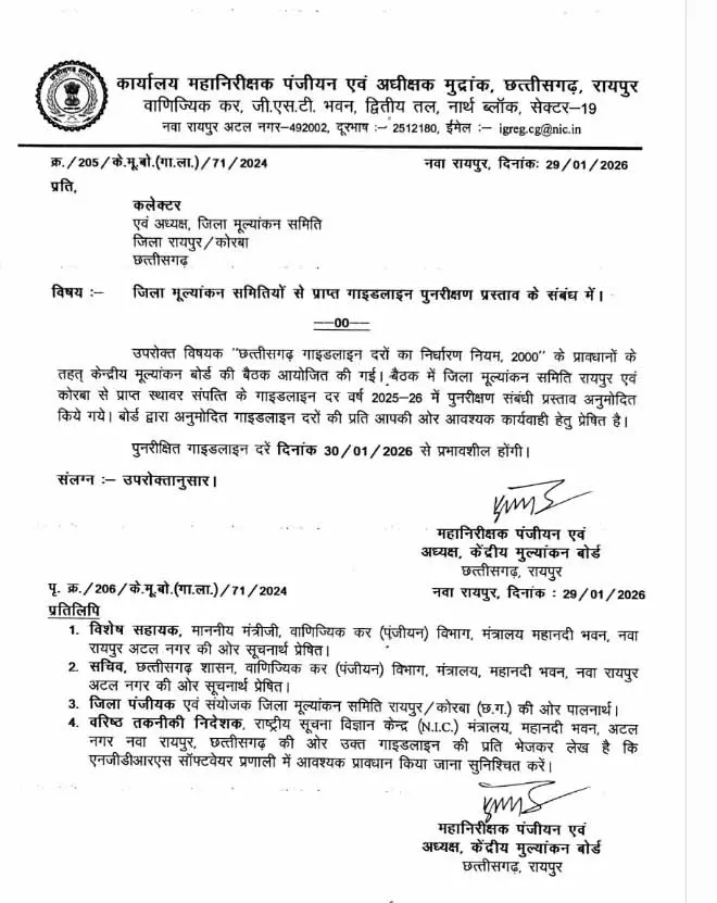 गौरतलब है कि छत्तीसगढ़ शासन ने वर्ष 2025-26 के लिए नई गाइडलाइन दरें पूरे राज्य में लागू की थीं। “छत्तीसगढ़ गाइडलाइन दरों का निर्धारण नियम, 2000” के तहत केंद्रीय मूल्यांकन बोर्ड, रायपुर द्वारा अनुमोदित ये दरें 20 नवंबर 2025 से प्रभावी हुई थीं। यह संशोधन वर्ष 2018-19 के बाद पहली बार राज्यव्यापी स्तर पर किया गया था। दरअसल, पिछले करीब आठ वर्षों से गाइडलाइन दरों में कोई बदलाव नहीं होने के कारण बाजार मूल्य और गाइडलाइन मूल्य के बीच बड़ा अंतर पैदा हो गया था। इस अंतर को दूर करने के लिए शासन ने वैज्ञानिक पद्धति से दरों का रेशनलाइजेशन किया। इसमें जिलों की भौगोलिक स्थिति, शहरी और ग्रामीण संरचना, सड़क संपर्क, बसाहट और आर्थिक गतिविधियों में आए बदलावों को ध्यान में रखा गया।