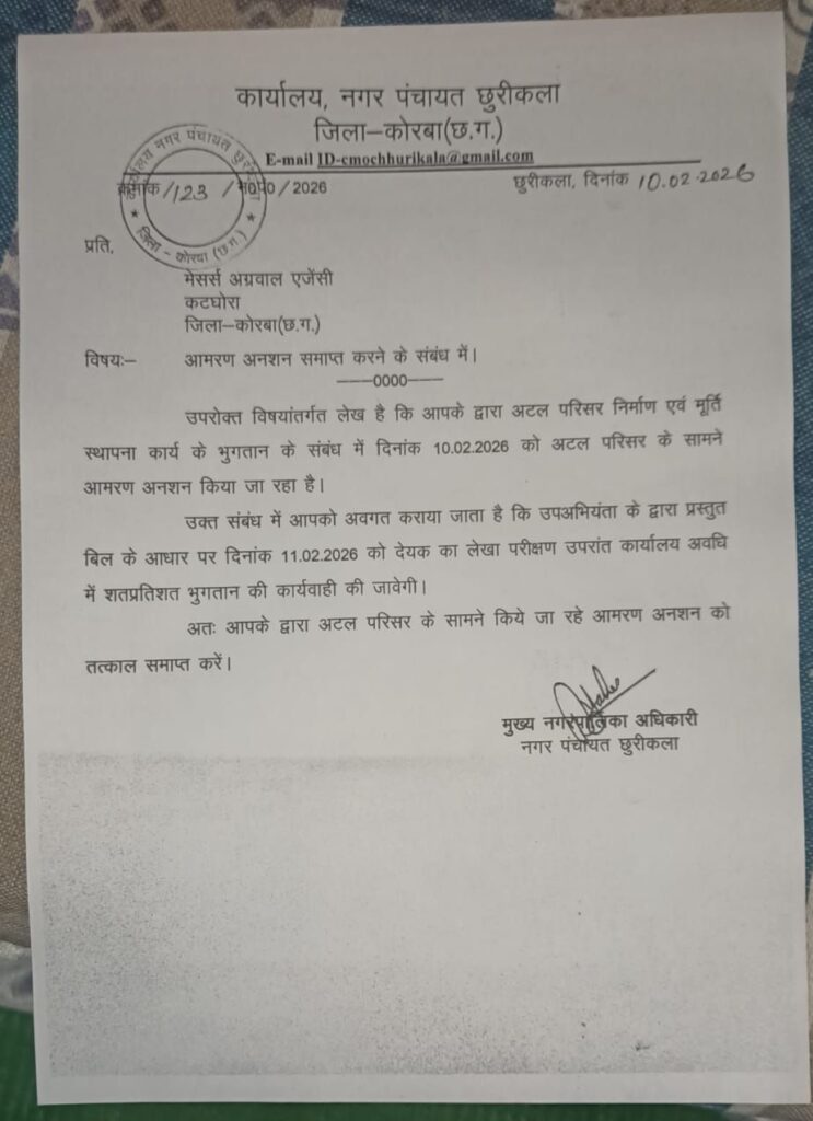 गौरतलब हो कि नगर पंचायत छुरीकला के द्वारा वर्ष 2024 में अटल परिसर निर्माण एवं मूर्तिस्थापना कार्य की निविदा अग्रवाल एजेंसी कटघोरा को दिया गया। अनुबंध के अनुसार ठेकेदार ने समयावधि के भीतर कार्य पूर्ण कर दिया। कार्य की कुल लागत 20 लाख थी जिसमें अभी तक कुल 40 प्रतिशत राशि का ही भुगतान होना बताया गया। शेष राशि के लिए विगत 6 माह से चक्कर कटवाया जा रहा था। कार्य पूर्ण होने के बाद भी भुगतान लंबित होने से परेशान अग्रवाल एजेंसी के प्रोपराइटर अनिल अग्रवाल ने भुगतान का उल्लेख करते हुए आमरण अनशन की चेतावनी भरा पत्र प्रेषित कर आज दोपहर से अनशन पर बैठ गए थे। ठेकेदार अनिल अग्रवाल की मांग को जायज ठहराते हुए ब्लॉक कांग्रेस कमेटी कटघोरा और जिला ठेकेदार संघ के सचिव असलम खान का पूर्ण समर्थन मिल रहा था । दिन भर नगरपंचायत सीएमओ और इंजीनियर एक दूसरे पर आरोप प्रत्यारोप मढ़ते रहे । सीएमओ का कहना है कि मुझ तक भुगतान संबंधी फाइल अब तक पहुंचा ही नहीं है दूसरी ओर इंजीनियर का कहना था कि मैं कल भुगतान संबंधी फाइल तैयार कर चेक कटवाने के लिए सीएमओ के टेबल में प्रस्तुत कर चुका हूं। अंततः देर रात्रि सीएमओ ने ठेकेदार को भुगतान संबंधी लिखित आश्वासन पत्र देकर अनशन समाप्त करा लिए।