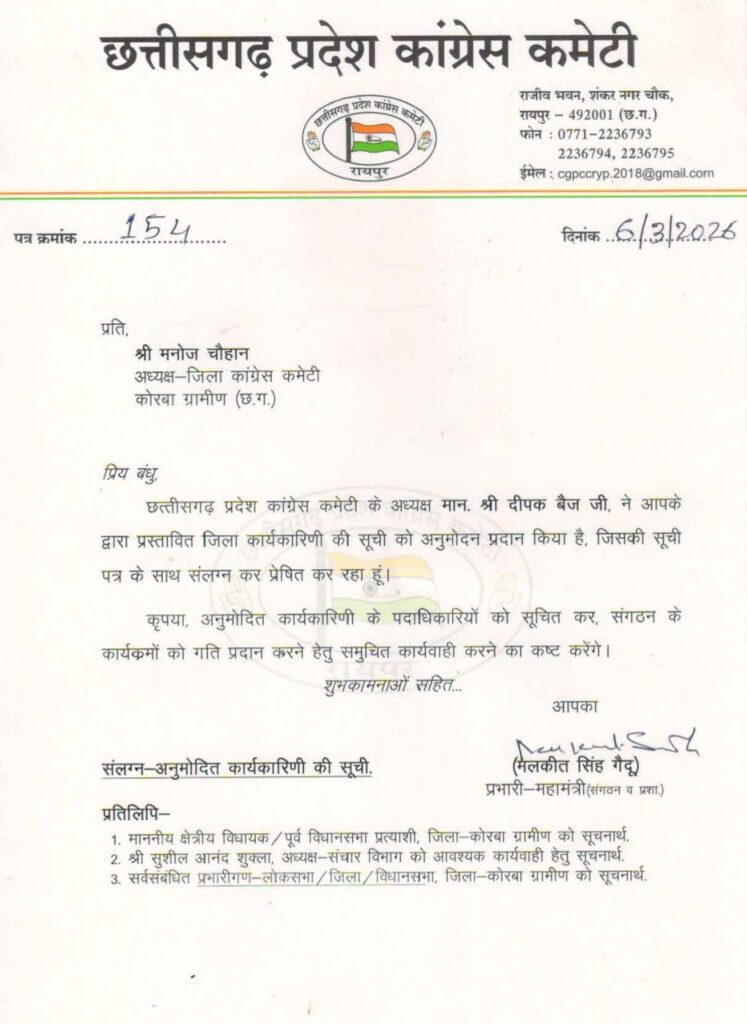 कटघोरा। छत्तीसगढ़ प्रदेश कांग्रेस कमेटी के अध्यक्ष दीपक बैज ने कोरबा ग्रामीण जिला कांग्रेस कमेटी की नई कार्यकारिणी सूची को अनुमोदन प्रदान कर दिया है। यह सूची कोरबा ग्रामीण जिला कांग्रेस अध्यक्ष मनोज चौहान द्वारा प्रस्तावित की गई थी। अनुमोदन के साथ ही कटघोरा के वरिष्ठ कांग्रेसी नेता राजीव लखनपाल को जिला कांग्रेस कमेटी ग्रामीण का उपाध्यक्ष नियुक्त किया गया है।